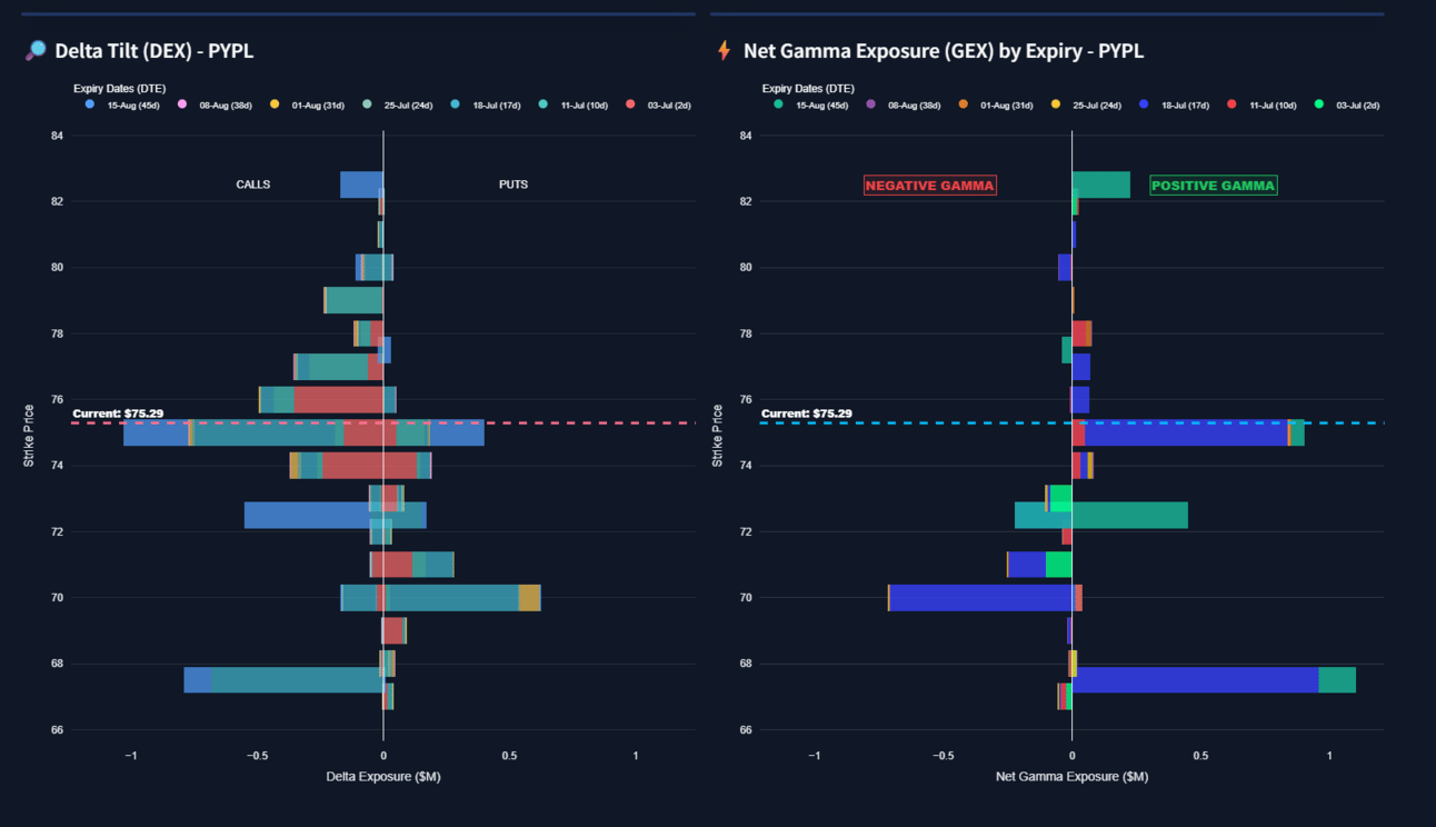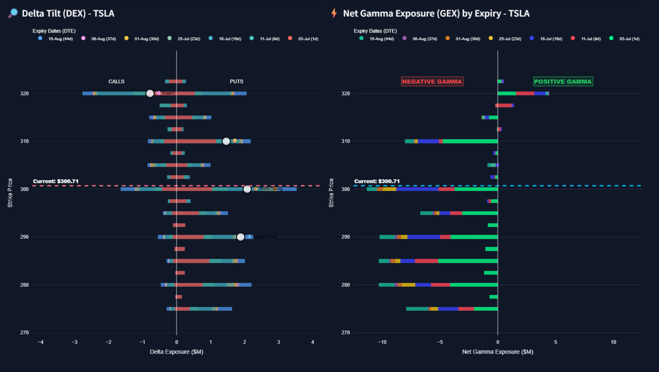 If $TSLA breaks decisively above the $320 area, we could see some gamma squeeze type action. A gamma squeeze occurs when a rapid increase in the underlying stock price (often fueled by call option buying) forces market makers who have sold call options to buy more shares to hedge their growing delta exposure. This creates a self-reinforcing cycle of buying that can accelerate the stock's upward movement.