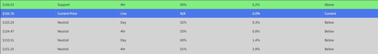 JNJ appears to have a decent higher timeframe set-up (4 hour), we like the squeeze and also the presence of momentum on the higher timeframes. Watching the $155 to act as support and target at $160 area